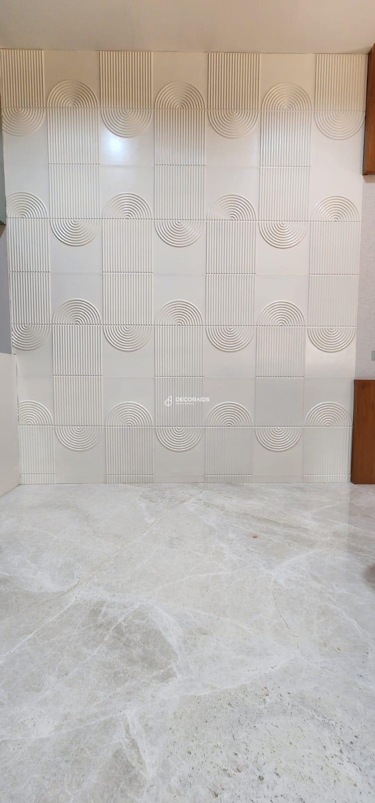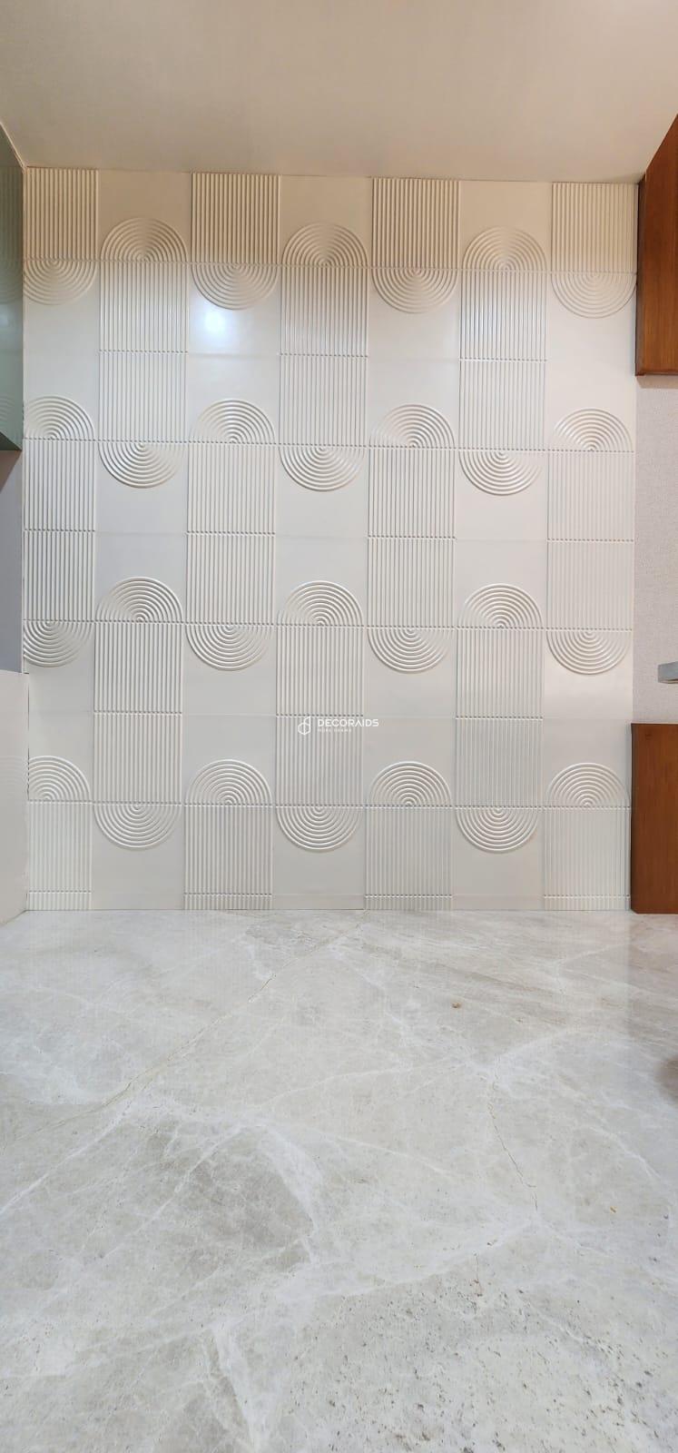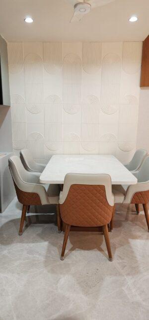 This contemporary home in Ahmedabad features Elegant Lines wall panels, creating a refined and artistic dining space. The subtle geometric curves and linear textures add depth while maintaining a soft, minimal aesthetic. The neutral finish enhances natural lighting and complements modern furniture, resulting in a sophisticated, calm, and visually balanced residential interior.